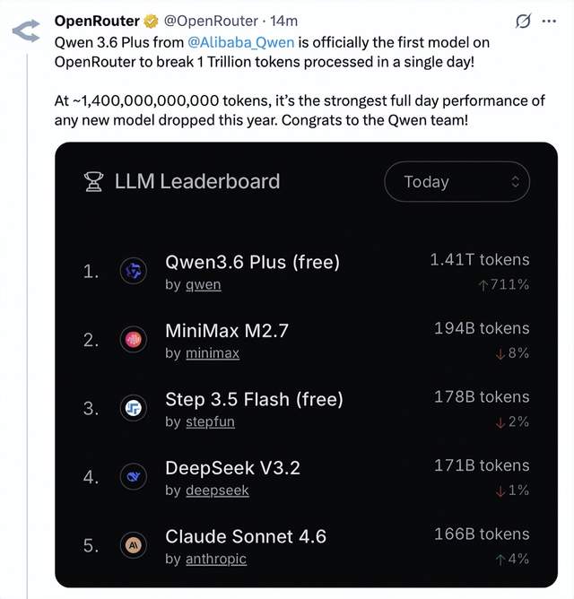 📰 资讯来源 量子位 🔗 查看原文 → 📖 阅读导引 4月4日消息,发布仅1天的阿里千问新模型Qwen3.6-Plus,冲上全球知名大模型API调用平台Open […]
